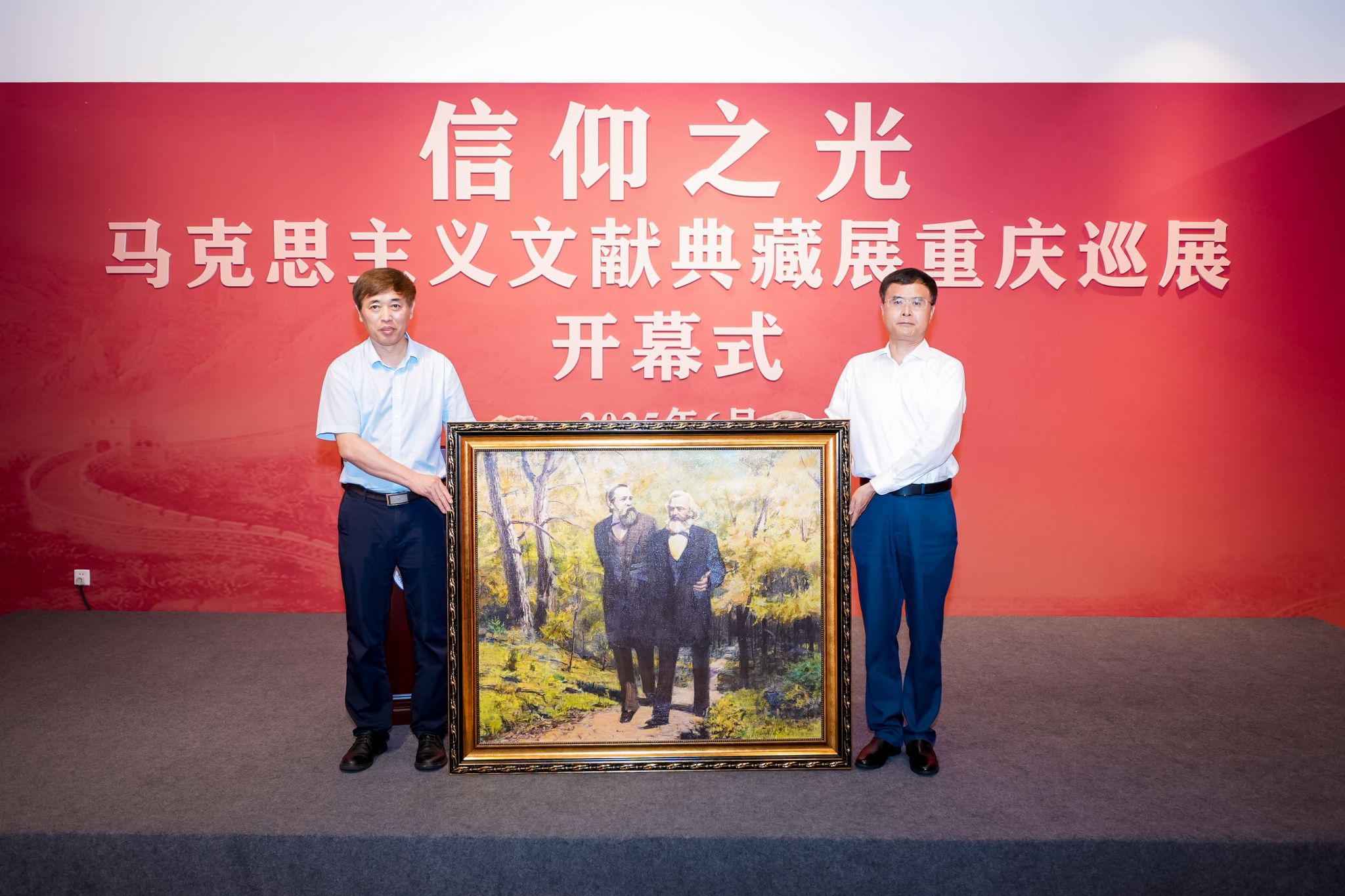 展览开幕式上,中央党史和文献研究院信息资料馆馆长许先春向西南大学马克思主义学院赠送马克思、恩格斯题材宣传画。
